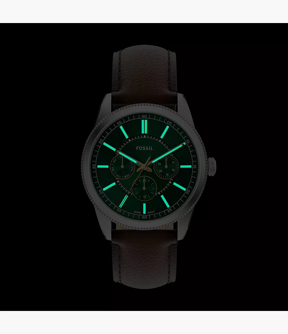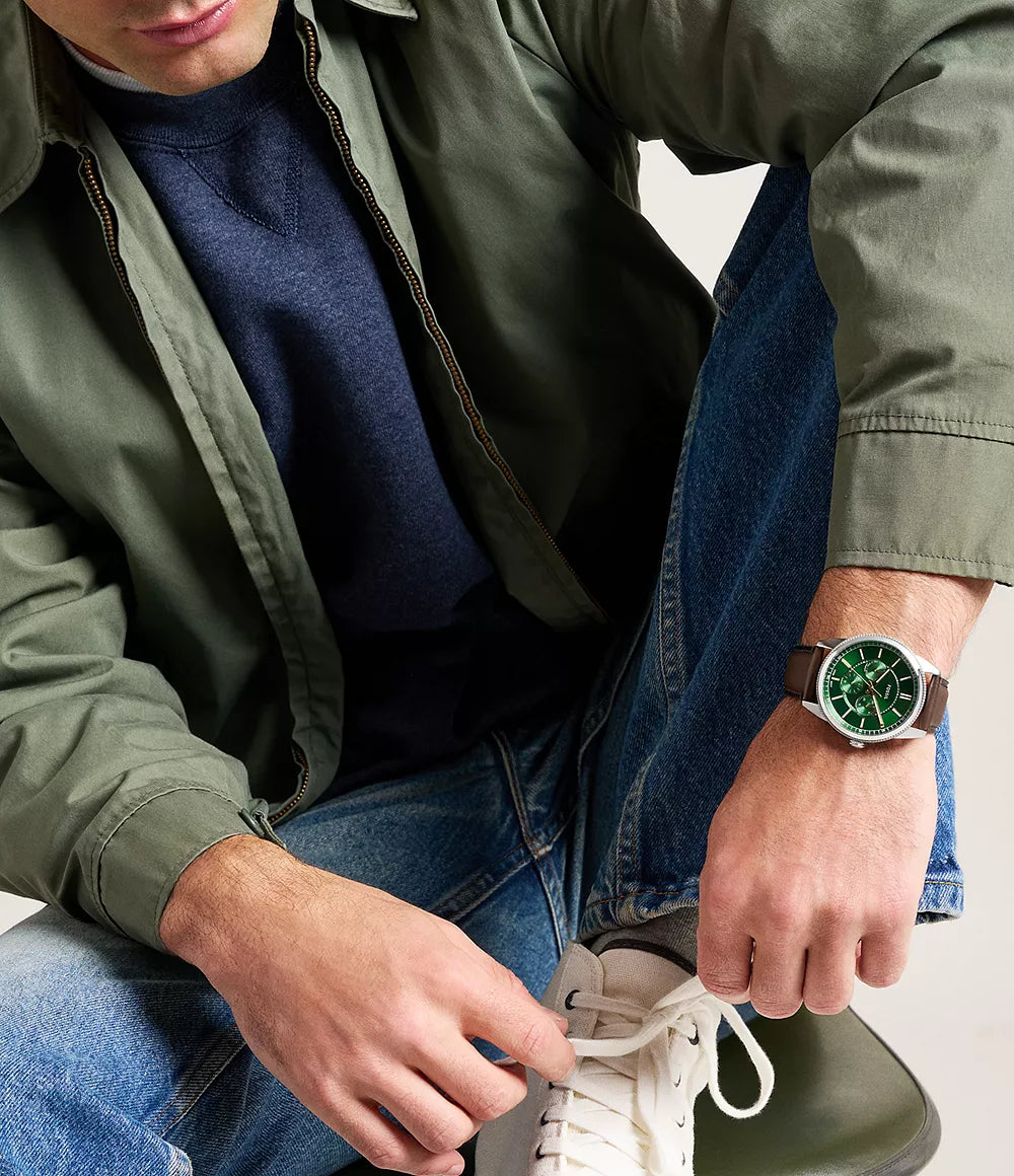 A stainless steel-tone case frames a green dial with sunray finishing, creating subtle texture and depth. The green dial features a sunray finish for added depth, complemented by practical sub-dials for day, date, and 24-hour functionality. Paired with a rich brown leather strap, it combines everyday comfort and polished craftsmanship. Thoughtful material choices and a balanced design make this watch a refined addition to your accessories lineup.