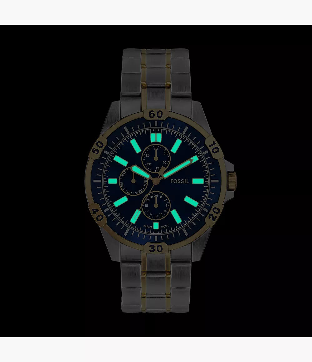 Garrett is an oversized watch with classic sport styling. The two-tone stainless steel bracelet combines silver-tone and gold-tone finishes for a refined contrast, complementing the matching case. A rich blue sunray dial creates depth, and multifunction sub-dials add practical detail. Thoughtfully crafted with quality materials, this watch emphasizes both design and everyday wearability.