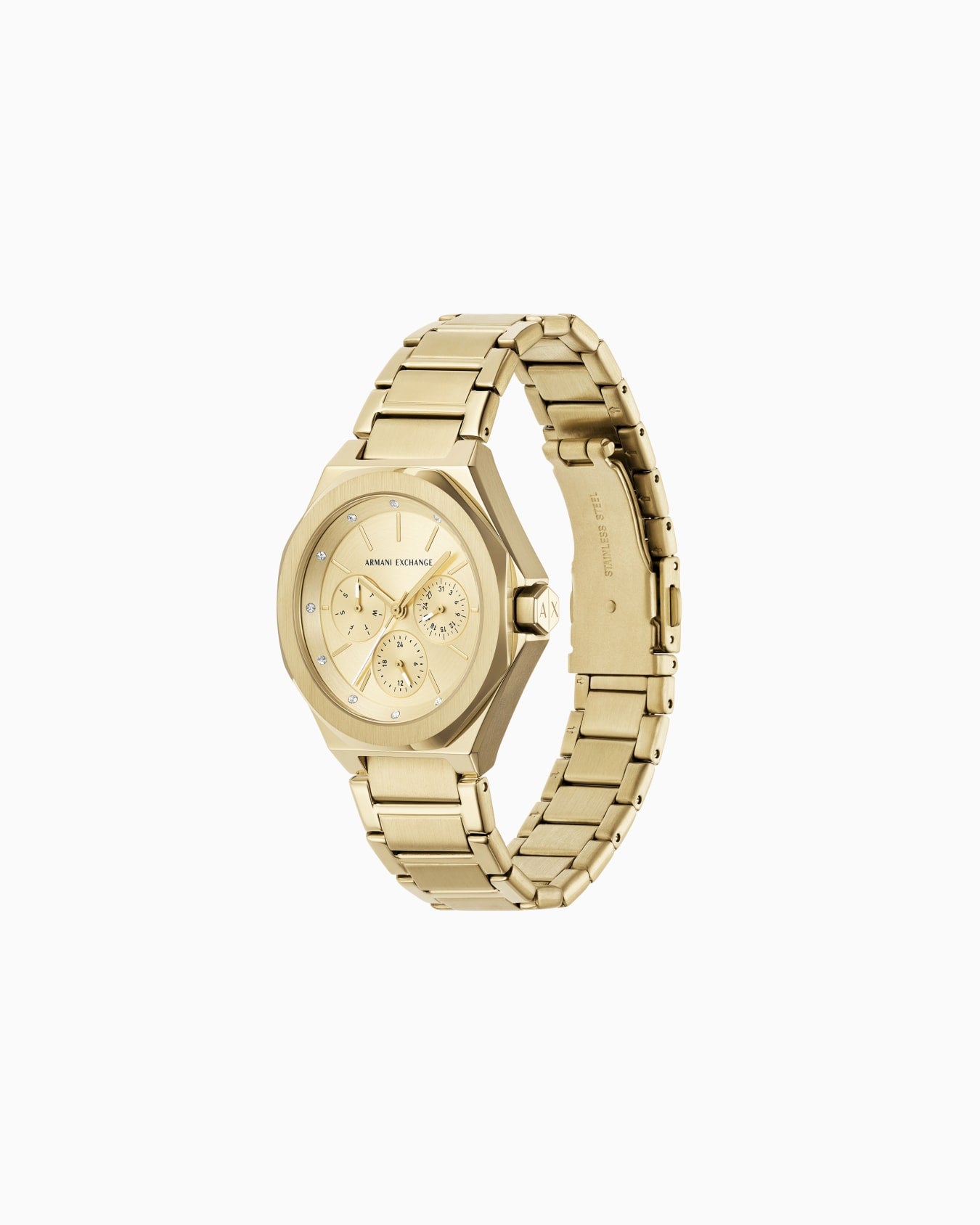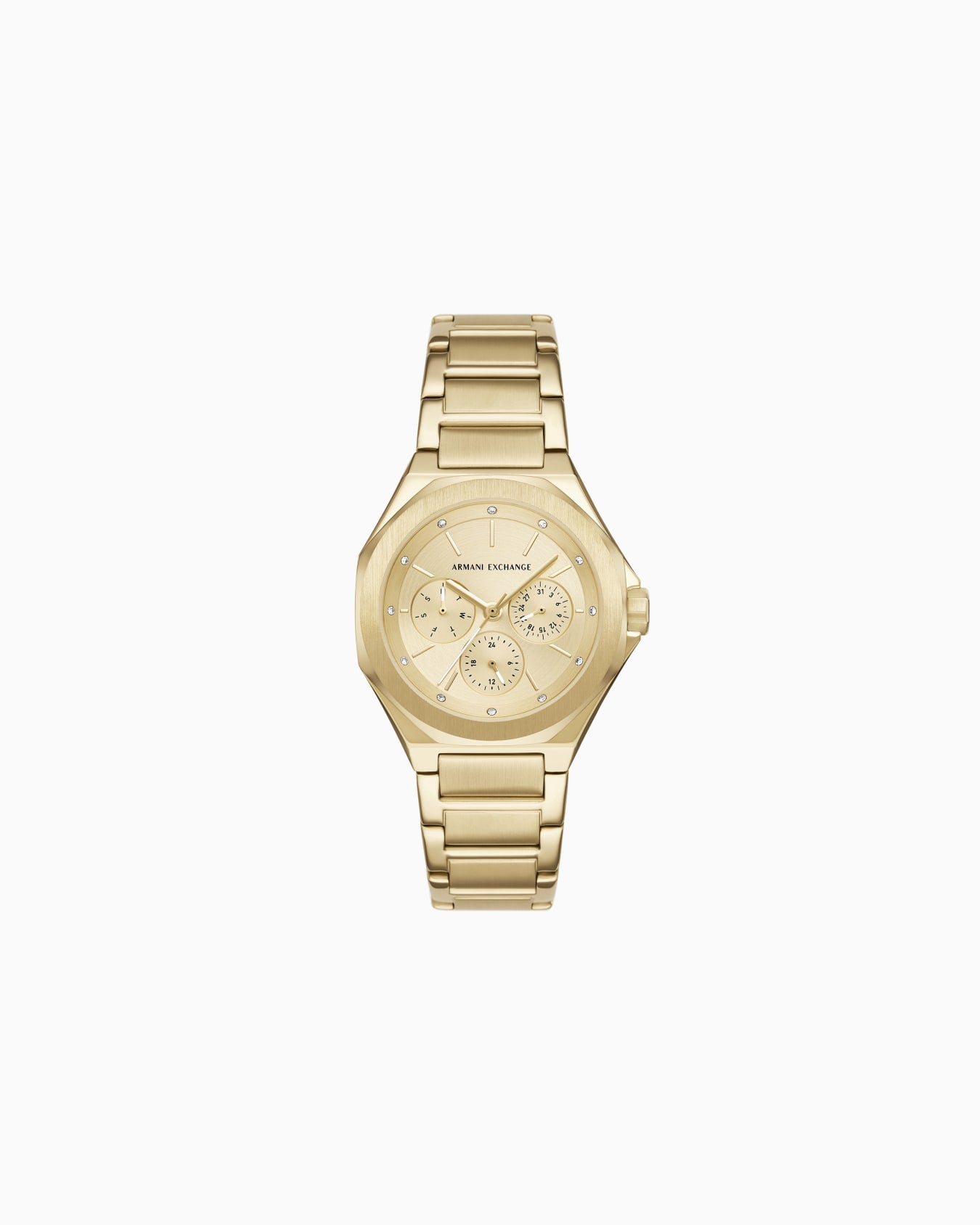 Armani Exchange's 36MM watch featuring a brushed gold-tone dial pairs seamlessly with the matching bracelet, creating a monochromatic design that feels modern and cohesive. The octagonal case adds a geometric edge, while multifunction sub-dials bring added utility. Finished with a two-pusher foldover clasp, this stainless steel bracelet watch is a statement in streamlined sophistication